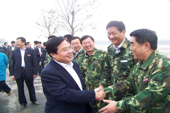 4月10日上午,山東省黨政代表團在省委書記姜異康、省長姜大明率領下,到北川新縣城檢查指導援建工作,山東省十七地市黨政負責人參加檢查。徐鵬強董事長在集團公司援建的安昌河堤頂道路上迎接檢查團并陪同檢查。