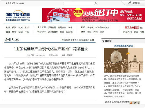“山東省建筑產業現代化生產基地”花落昌大——中國工程建設網“企業動態”2014.9.28