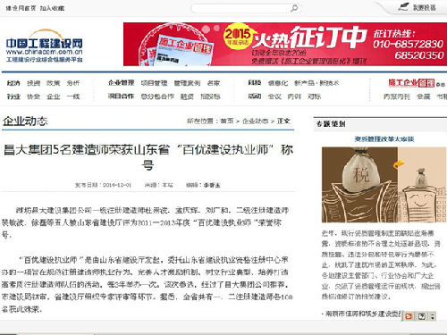 集團5名建造師榮獲山東省“百優建設執業師”稱號——中國工程建設網“企業動態”2014.12.0