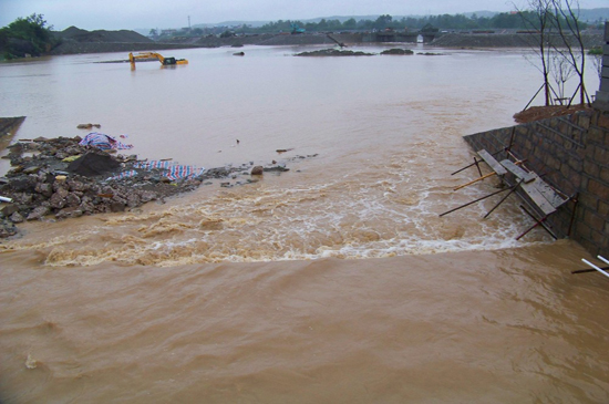 7月24日至25日,一場特大暴雨突襲北川新縣城,集團(tuán)公司援建的多處工地受到影響。至25日凌晨,職工宿舍、辦公室、食堂等地方進(jìn)水高達(dá)40cm,集團(tuán)公司的援川人員,特別是第八分公司的員工及時展開自救。幾個小時內(nèi),大家先后將室內(nèi)的物品轉(zhuǎn)移到高處沒有進(jìn)水的房間,天一亮,指揮部便緊急組織工地?fù)岆U,大家分工協(xié)同,分別趕赴安昌河下游施工段和安昌河已驗收河段查看受災(zāi)情況……由于指揮部早在20日就下達(dá)安昌河防防汛通知,各施工單位提前應(yīng)對,從而保證在這次特大洪水來臨時,所有施工人員安全撤離、所有材料轉(zhuǎn)移(由于汛情超過預(yù)想,第八分公司安昌河下游施工段景觀濕地形成了大面積積水致使一些土方機(jī)械過水)。此次洪水來襲,已竣工的安昌河段安然無恙,第八分公司正在施工的安昌河下游溢流堰、擋水堰已經(jīng)合攏,經(jīng)受住了洪水沖擊。 ![]() 洪水中的施工現(xiàn)場