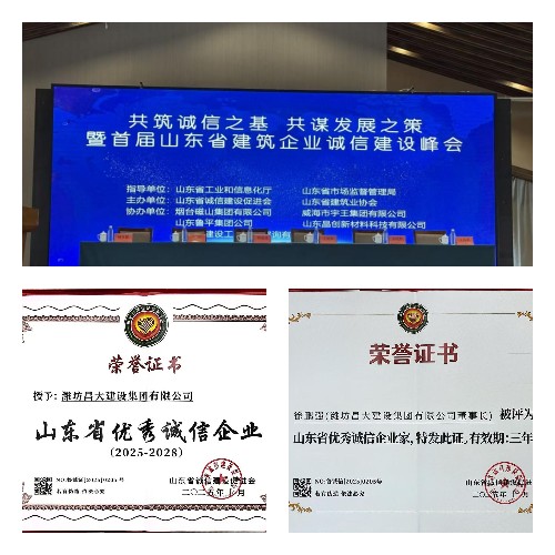 近日,由山東省誠信建設促進會組織的“共筑誠信之基,共謀發展之策暨首屆山東省建筑企業誠信建設峰會”在山東煙臺隆重召開。會上,山東省誠信建設促進會公布了首屆建筑業山東省優秀誠信企業及優秀誠信企業家”名單,集團公司榮獲山東省優秀誠信企業稱號,董事長徐鵬強被評為山東省優秀誠信企業家。