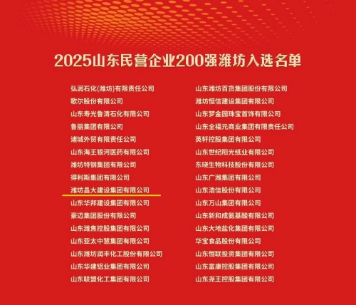 會上,昌大建設集團憑借穩健的發展、突出的行業貢獻及良好的社會口碑,不僅入選2025濰坊市50強企業名單,還連續榮獲2025山東民營企業200強等多項省級榮譽。同時集團所屬泰和置業有限公司還獲得2025山東民營企業服務業100強等省級榮譽,充分彰顯了集團作為濰坊建筑業領軍企業的實力、地位和作用。
